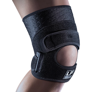 The LP Support Extreme Knee Support with Patella Tendon Strap features an adjustable strap with a cushioning pad that applies compression to the patellar tendon. The semi-circle pad is designed to relieve pressure on the patella, while the extra strap provides additional compression and stability to a weak knee joint.